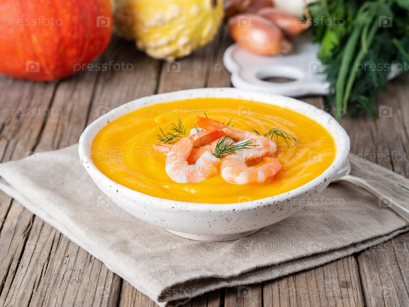 Вкусный желтый тыквенный крем-суп с креветками на темно-сером старом деревенском деревянном столе, вид сбоку