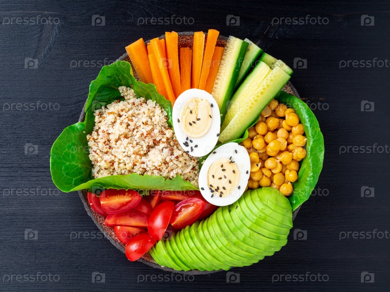 Вегетарианская чаша Будды, смесь овощей. Авокадо, киноа, нут, овощи, яйца, вид сверху