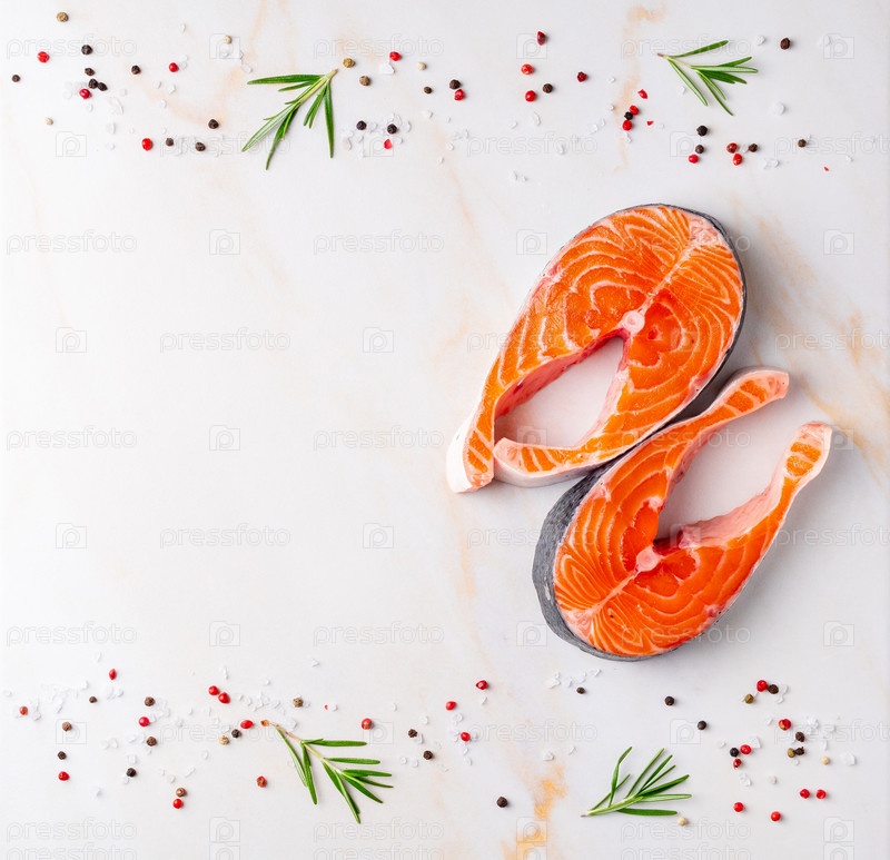 Фон из еды, стейки лосося и приправы на белом кремовом мраморном столе, плоская планировка, место для копирования