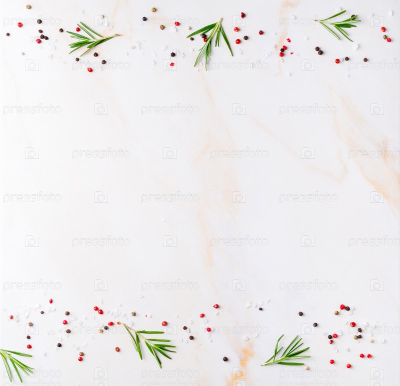 Фон из еды, специи и приправы, розмарин с солью и перцем на белом кремовом мраморном столе, место для копирования, плоская планировка, вид сверху
