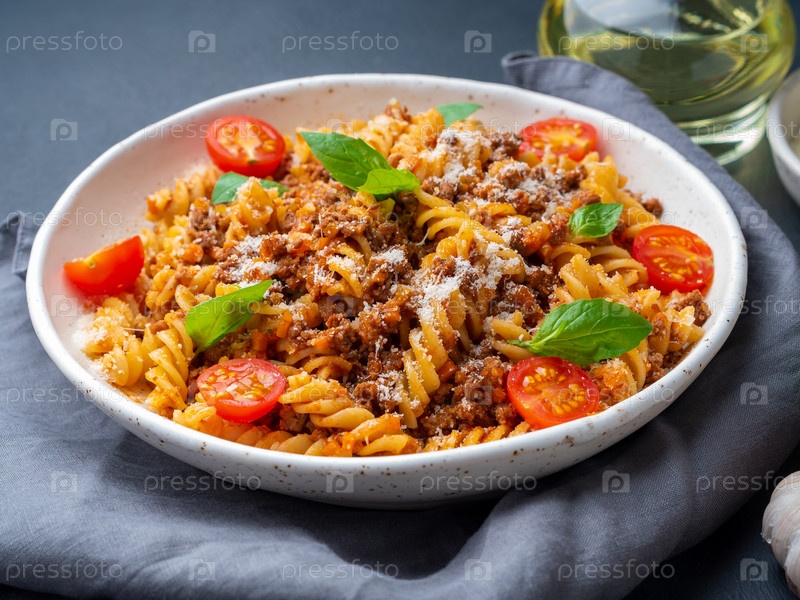 Паста Болоньезе. Фузилли с томатным соусом, говяжьим фаршем, листьями базилика. Традиционная итальянская кухня. Вид сбоку