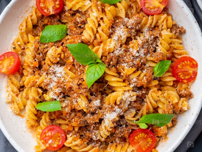 Паста Болоньезе. Фузилли с томатным соусом, рубленая говядина