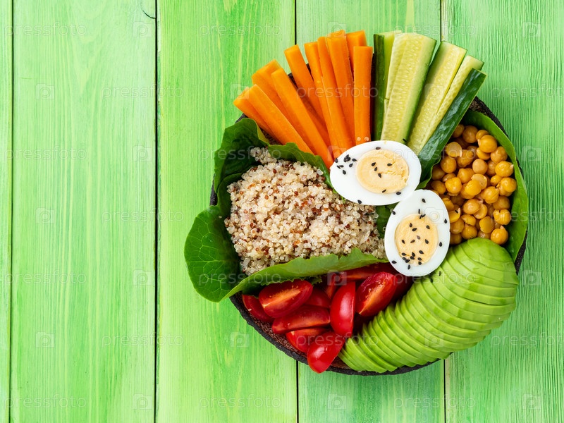 Вегетарианская чаша Будды, смесь овощей. Авокадо, киноа, нут, овощи, яйца, вид сверху, место для копирования