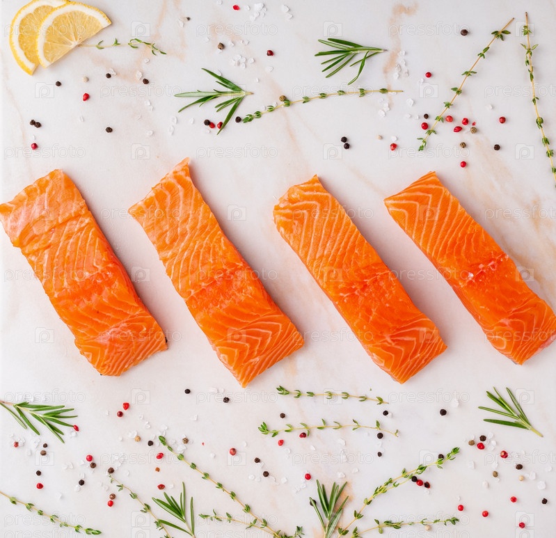 Фон еды, нарезанные порции больших стейков филе лосося и приправы на белом кремовом мраморном столе, плоская планировка