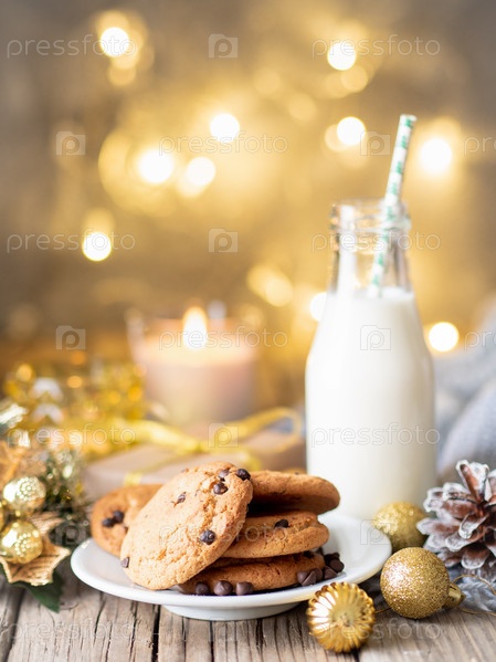 Рождественский фон с шоколадным печеньем, бутылкой с молоком. Уютный вечер, кружка напитка, рождественские украшения, свечи и гирлянды огней