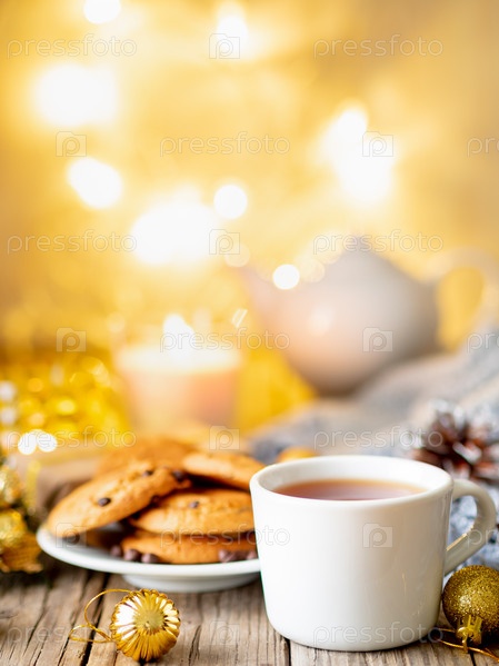 Рождественский фон с шоколадным печеньем, чашкой чая. Уютный вечер, кружка напитка, рождественские украшения, свечи и гирлянды огней