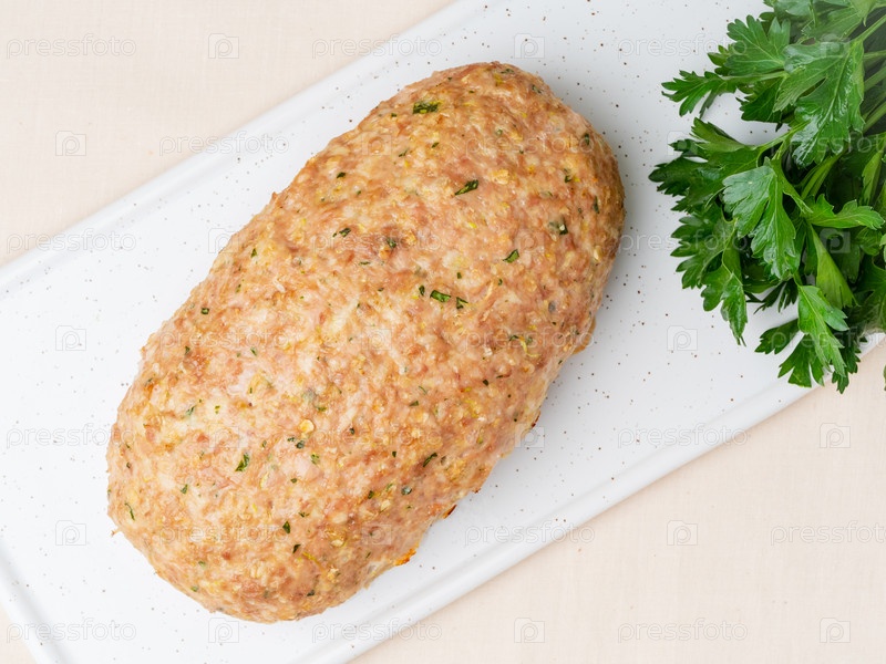 Террин, мясной рулет. Запеченный фарш из индейки. Традиционное французское и американское блюдо. Вид сверху, белый мраморный фон