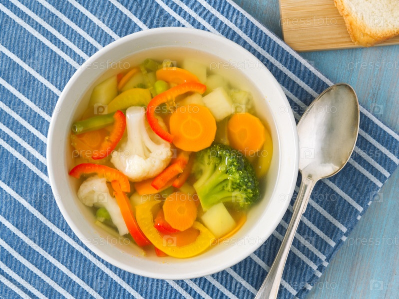 Яркий весенний овощной диетический вегетарианский суп с цветной капустой, брокколи, перцем, морковью, зеленым горошком. Вид сверху, синий деревянный фон, льняная салфетка