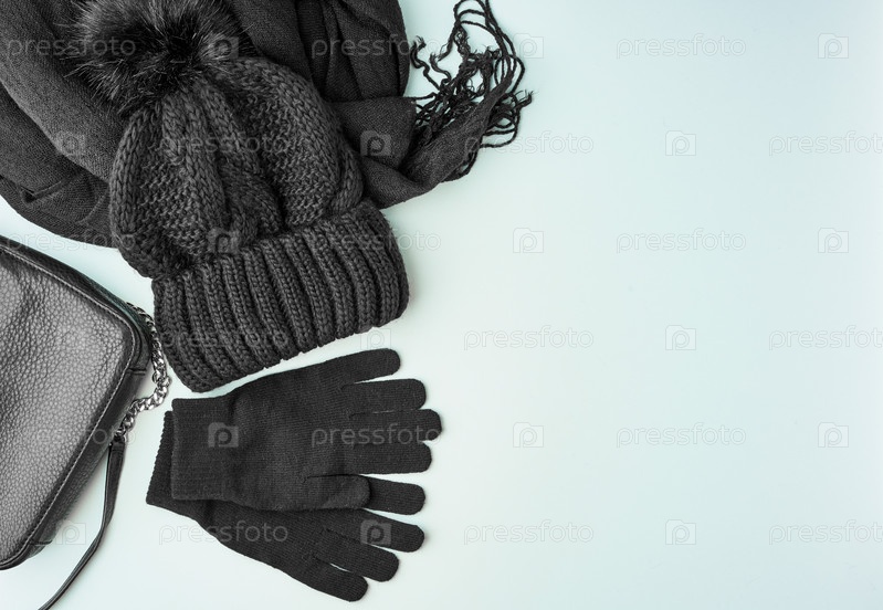 Теплые женские аксессуары для зимы или осени - черный вязаный шарф, шапка,
