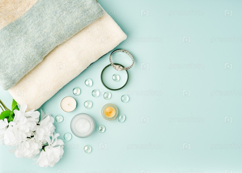 Плоские женские аксессуары с косметикой, крем для лица на пастельно-голубом столе, место для копирования