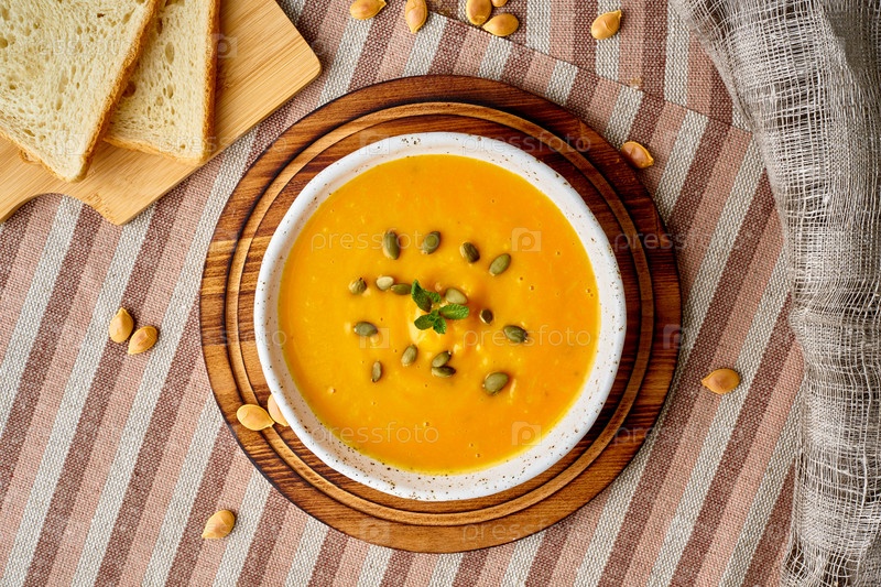 Суп-пюре из тыквы, диетическое вегетарианское блюдо на темно-коричневом деревянном столе, вид сверху, крупный план