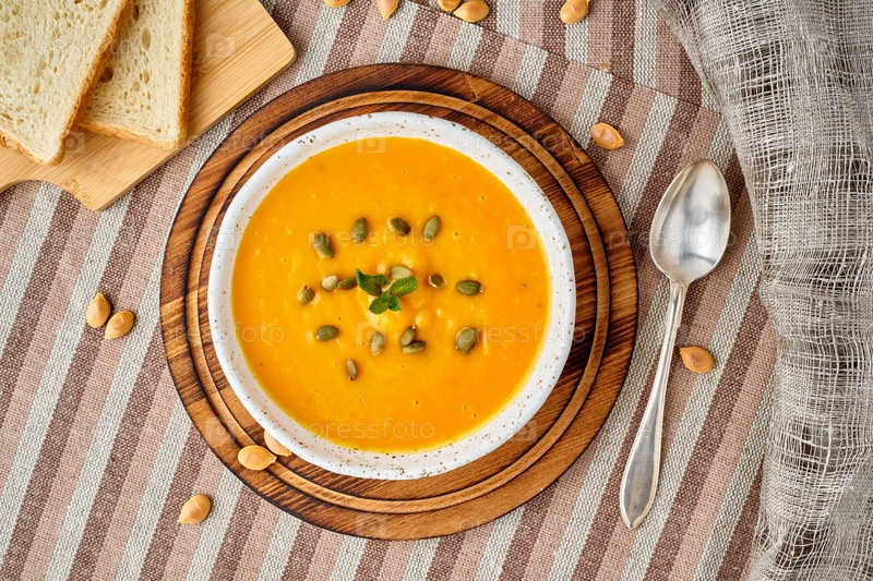 Суп-пюре из тыквы, диетическое вегетарианское блюдо на темно-коричневом деревянном столе, вид сверху, крупный план