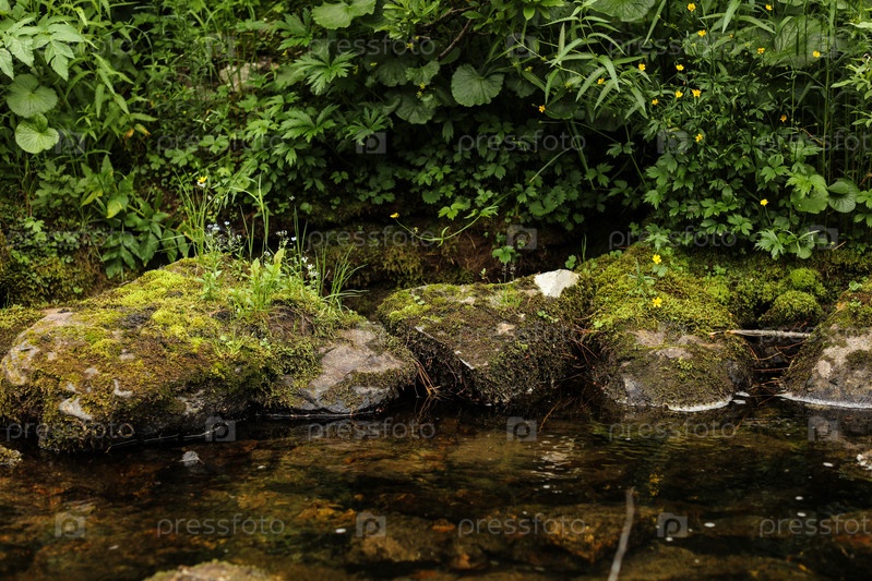 Каменистый берег горной реки, поросший мелкой травой, с прозрачной водой