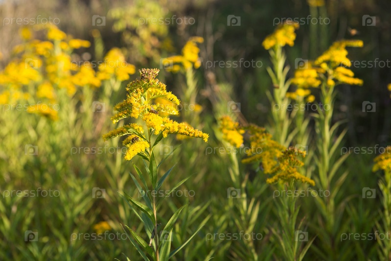 Желтые цветы Золотильник обыкновенный Естественный фон .Solidago virgaurea