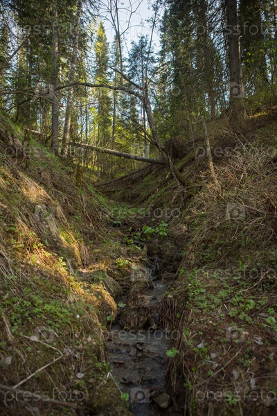 Красивый зеленый лес со мхом и небольшими оврагами, послевоенные окопы