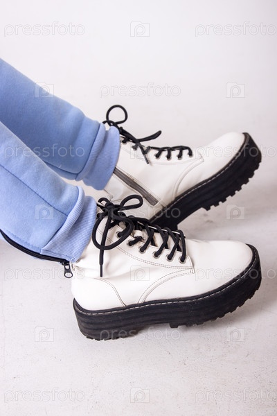 Женские кроссовки. Белые женские туфли на ногах. Кроссовки крупным планом