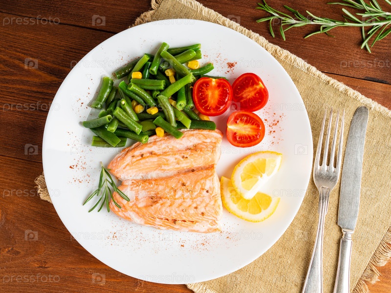 Рыба лосось на пару с овощами. Здоровое диетическое питание, темный деревянный фон, вид сверху, крупный план