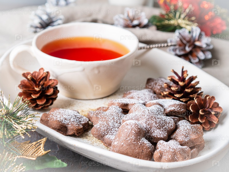 Рождественская или новогодняя открытка. Зимняя праздничная композиция, вид сбоку, селективный фокус, синий, серый фон. Чашка чая, печенье, шишки, свечи, подарок