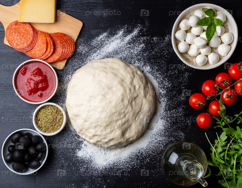 Сырое тесто для пиццы с ингредиентами и специями на темном черном фоне, вид сверху, плоская планировка