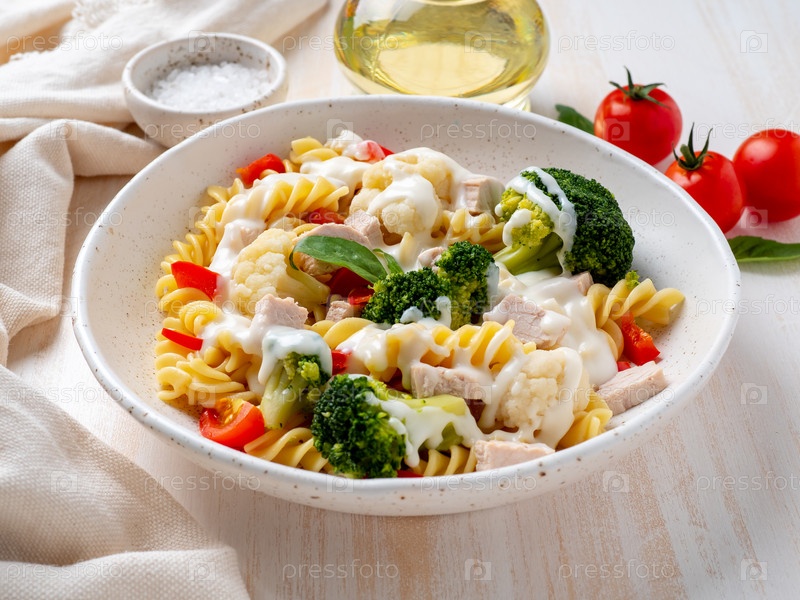 Паста фузилли с овощами, вареное паровое мясо, белый соус на белом деревянном столе, низкокалорийная диета, диета с низким содержанием жиров, вид сбоку