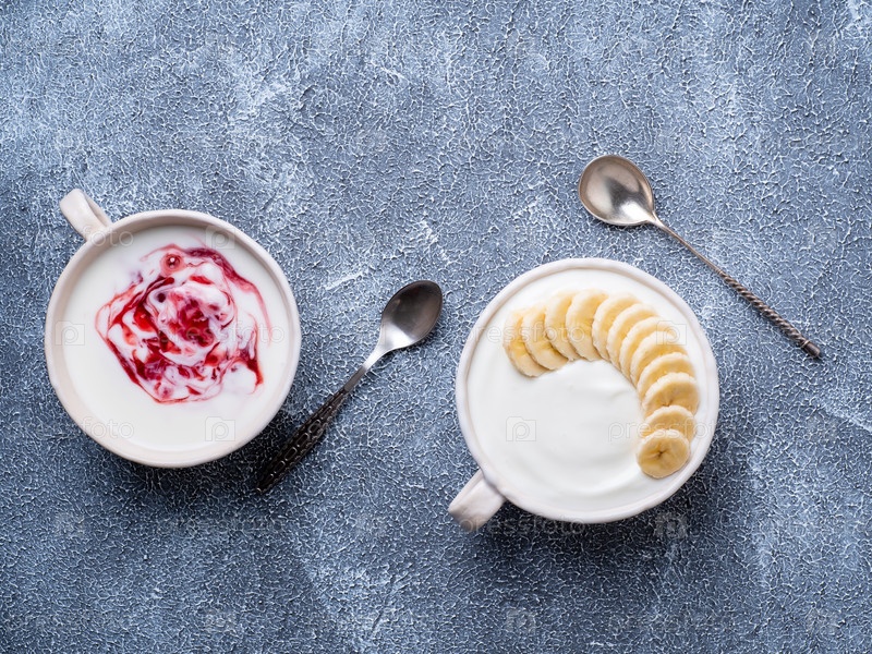 Два греческих йогурта с джемом и бананом в белой миске на серо-голубом бетонном столе, вид сверху