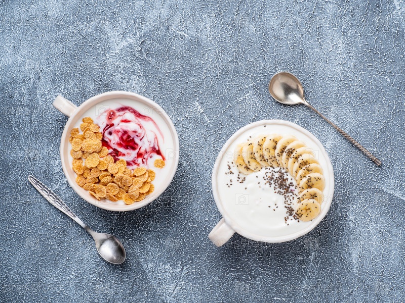 Греческий йогурт с джемом в белой миске на серо-голубом бетонном столе, вид сверху, место для копирования