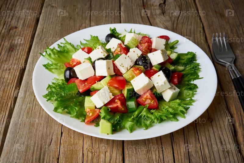 Греческий салат на белой тарелке на старом деревенском деревянном столе, вид сбоку