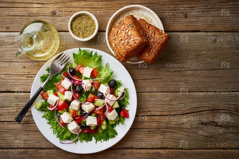 Греческий салат на белой тарелке на старом деревенском деревянном столе, вид сверху, место для копирования