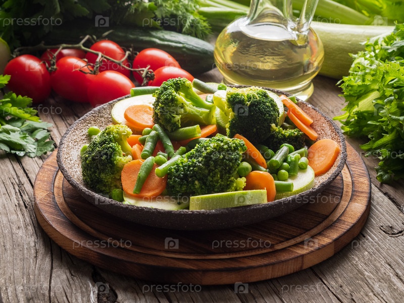 Смесь отварных овощей, паровых овощей для диетического низкокалорийного питания. Брокколи, морковь, цветная капуста, вид сбоку