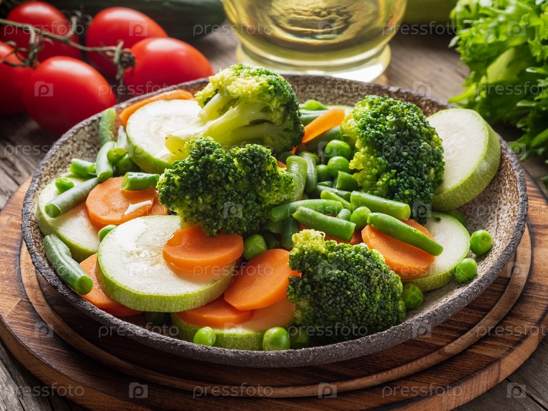 Смесь отварных овощей, паровых овощей для диетического низкокалорийного питания. Брокколи, морковь, цветная капуста, вид сбоку