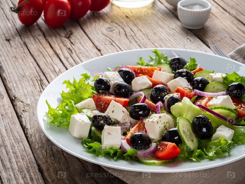 Греческий салат на белой тарелке на старом деревенском деревянном столе, вид сбоку