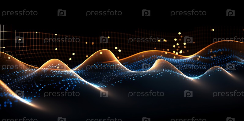Абстрактные синие и желтые волны на темном фоне и огни боке