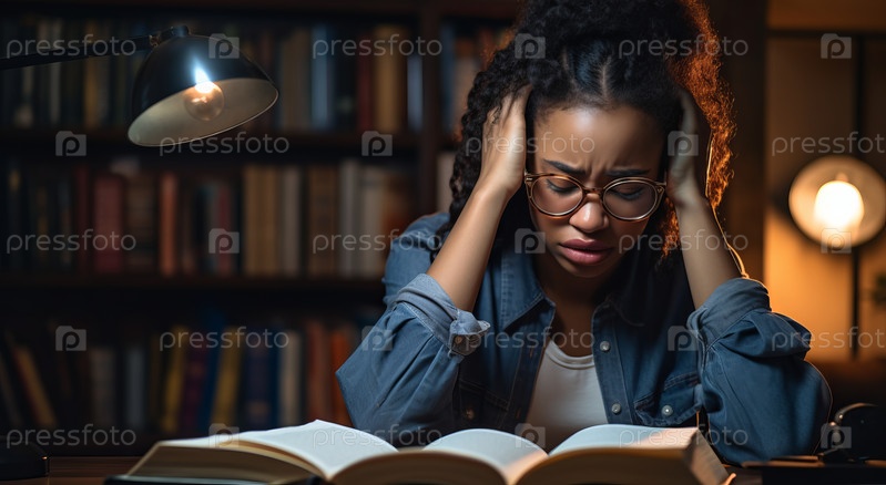 Уставшая студентка сидит в библиотеке, обхватив голову руками. Иллюстрация усталости от тяжелой нагрузки на учебе