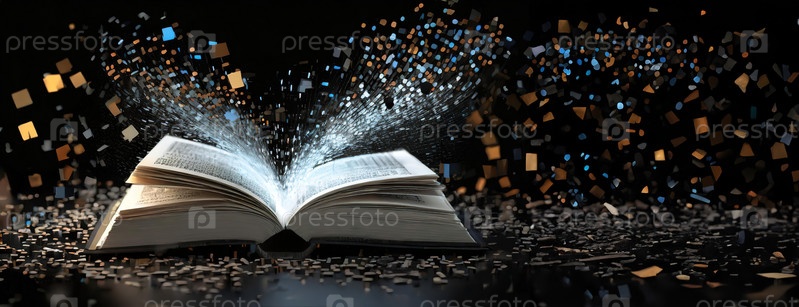Открытая книга с вырывающимися из нее буквами и фигурами, олицетворяющая силу знаний и творчества в динамичном визуальном оформлении