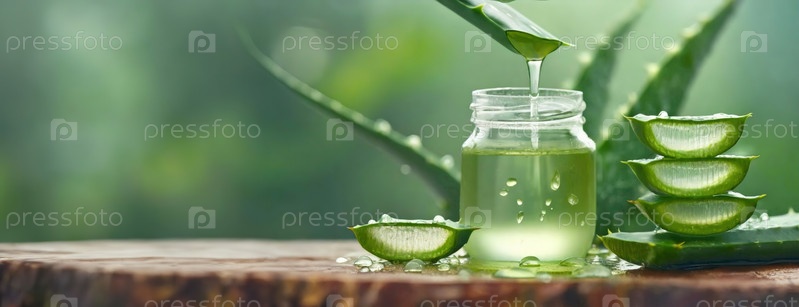 Гель алоэ вера капает с листьев в банку на деревянной поверхности. Панорама с местом для копирования
