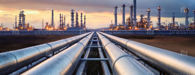 Крупный промышленный нефтеперерабатывающий завод с трубопроводами, ведущими к объекту, под облачным небом на закате, демонстрирующий энергетическую инфраструктуру