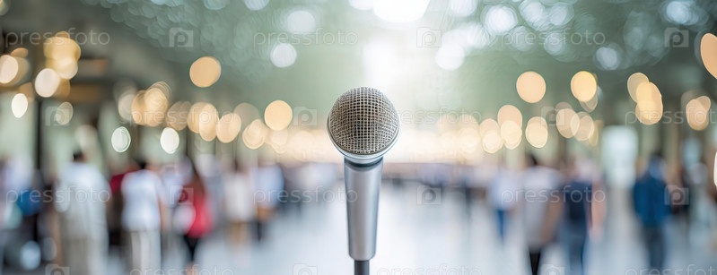 Микрофон в фокусе на размытом фоне людей и огней, передающий суть публичного выступления