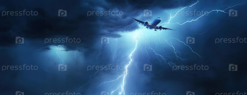 Самолет летит по неспокойному небу, наполненному молниями, вызывая в памяти образ самолета, пролетающего сквозь шторм во время суровой погоды