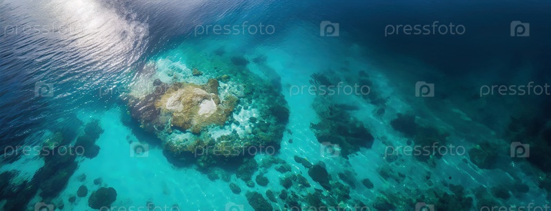 Солнечный коралловый риф в прозрачных тропических водах, демонстрирующий живую морскую экосистему. Вид сверху на нетронутый океан. Панорама с копировальным пространством