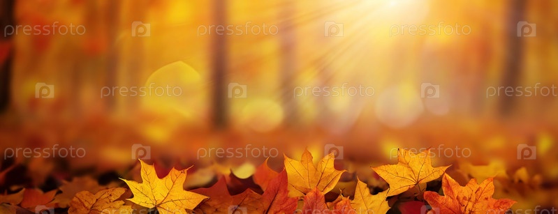 Красивая осенняя сцена с оранжевыми и желтыми листьями, покрывающими землю, и солнечным светом, пробивающимся сквозь деревья на заднем плане