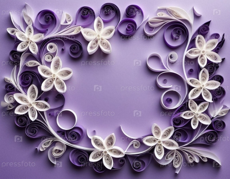 Бумажные цветы, выполненные в технике квиллинга. Цветы в оттенках фиолетового и белого, расположены по кругу на лавандовом фоне. Рамка с местом для копирования. Сгенерировано с помощью ИИ