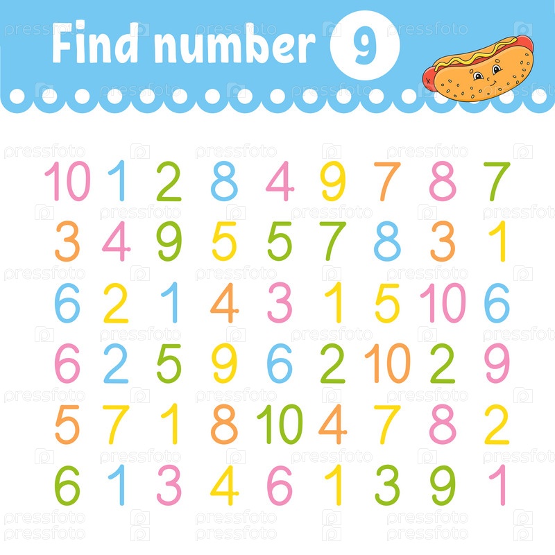 Найдите число. Образовательный развивающий рабочий лист. Страница с заданиями с картинками. Игра для детей. Забавный персонаж. Мультяшный стиль. Векторная иллюстрация
