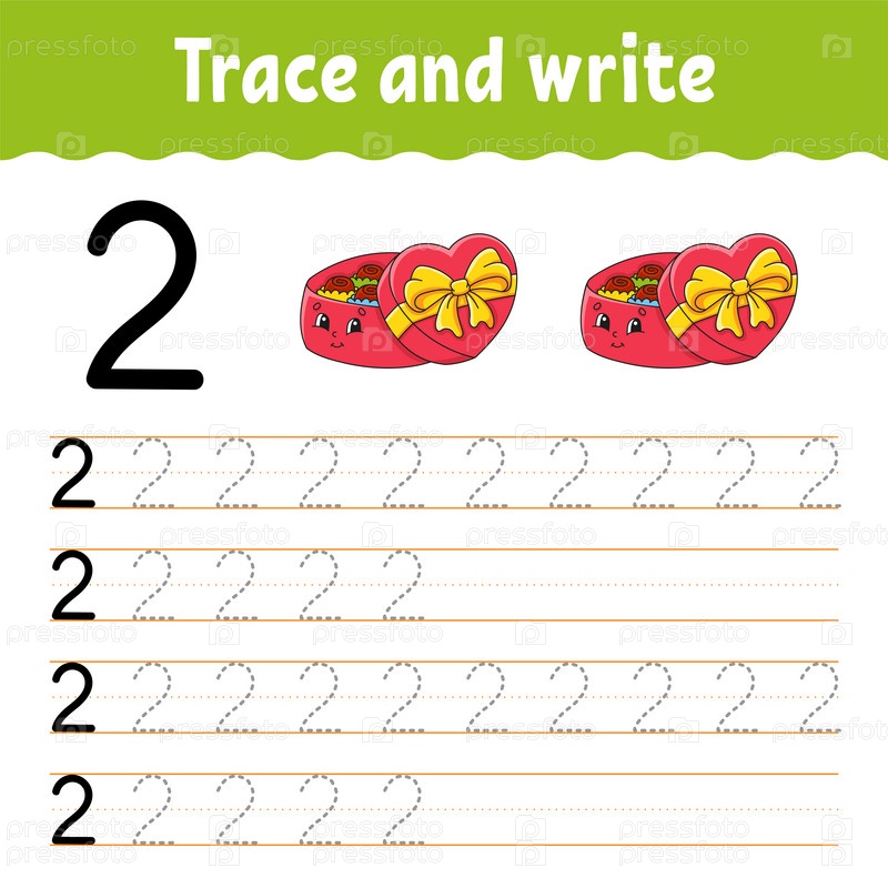 Изучайте цифры. Обводка и письмо. Практика письма. Образовательный развивающий рабочий лист. Цветная страница с заданиями. Изолированная векторная иллюстрация в милом мультяшном стиле