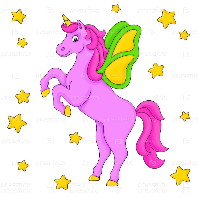 Единорог с поднятыми крыльями. Мультяшный персонаж. Красочная векторная иллюстрация. Изолированный на белом фоне. Элемент дизайна. Шаблон для вашего дизайна, книги, наклейки, открытки