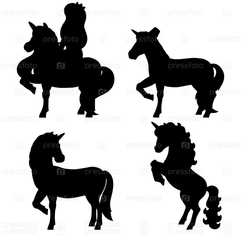 Волшебный фея единорог. Милая лошадь. Черный силуэт. Элемент дизайна. Векторная иллюстрация, изолированная на белом фоне. Шаблон для книг, наклеек, плакатов, открыток, одежды