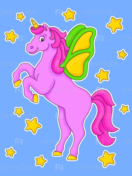 Милый единорог с поднятыми вверх крыльями. Мультяшный персонаж. Красочная векторная иллюстрация. Изолированный на синем фоне. Элемент дизайна. Шаблон для вашего дизайна, книги, наклейки, открытки