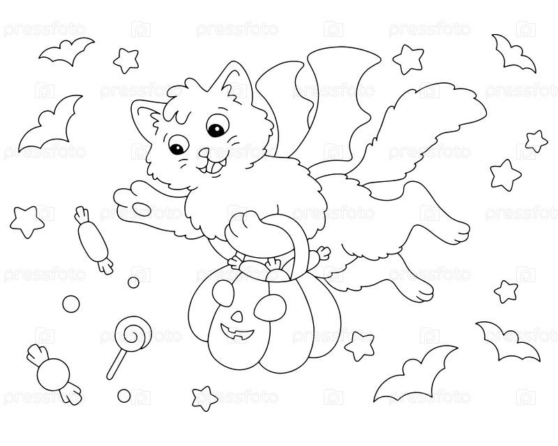 Милый кот несет в лапах тыкву со сладостями. Тема Хэллоуина. Страница раскраски для детей. Персонаж в мультяшном стиле. Векторная иллюстрация на белом фоне