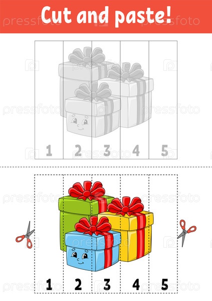 Изучаем цифры от 1 до 5. Вырезаем и склеиваем. Персонаж мультфильма. Образовательный развивающий рабочий лист. Рождественская тема. Игра для детей. Страница с заданиями. Цветная изолированная векторная иллюстрация