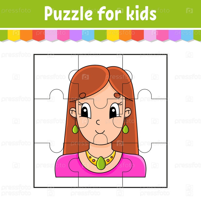 Игра-головоломка для детей. Кусочки пазла. Цветной рабочий лист. Страница с заданиями. Мультяшный стиль. Векторная иллюстрация