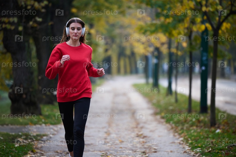 Молодая красивая женщина бежит в осеннем парке и слушает музыку в наушниках на смартфоне